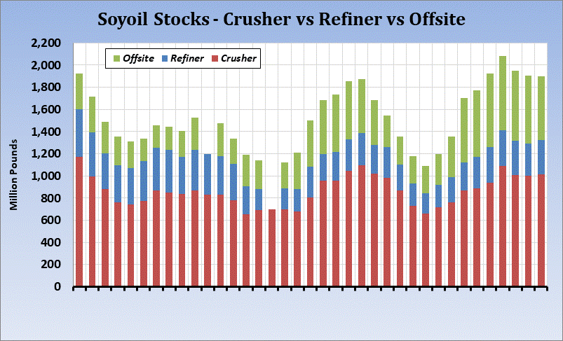 The soybean oil stocks data measures the amount in storage at the end of the month. If stocks are unusually high, analysts may become concerned about oversupply, and they may also become concerned that demand is not as strong as expected. Likewise, if oil stocks are lower than expected, analysts may be alerted to stronger than expected demand. In recent years there have been times when the soybean crush was running at a record pace and soybean oil stocks were declining. This was because soybean oil exports were strong. Biodiesel is another component for soybean oil demand.