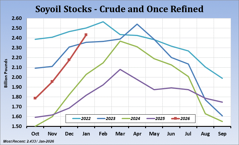 US soybean oil stocks (crude + once refined) in January came in at 2.433 billion pounds versus 2.177 last month and 1.817 last year. The average stock level for this time of year is 2.201 billion pounds. The largest stock level for this month was 2.500 (2022) and lowest was 1.817 (2025).