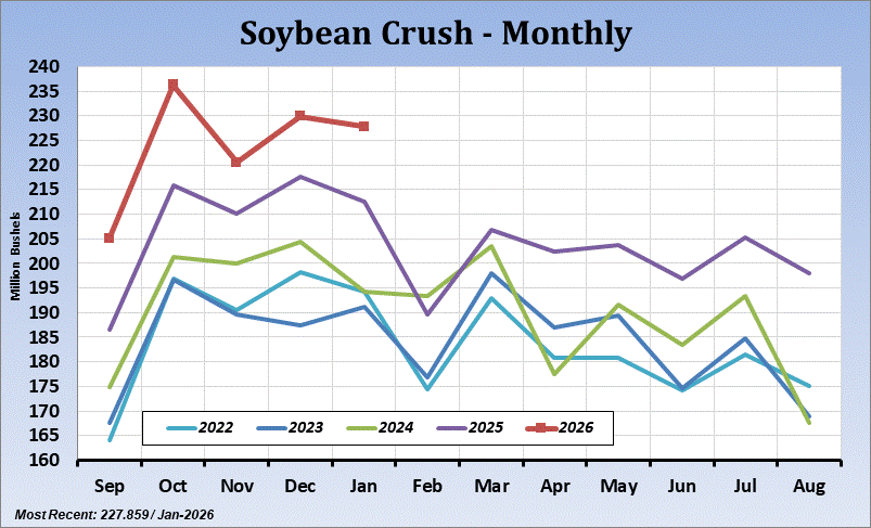 The cumulative crush for the marketing year has reached 1.12 billion bushels 43.6% of the USDA's current estimate for the marketing year. As of January last year, the cumulative crush had reached 42.6% of the USDA forecast of 1.04 billion bushels.