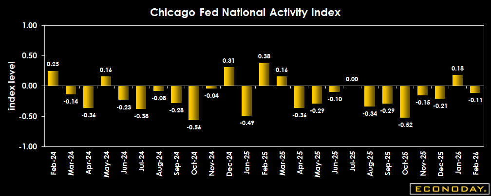 The Chicago Fed national activity index (CFNAI) is down to minus 0.11 in February after positive 0.20 in January. The four broad categories of indicators that make up the index show 1 positive and 3 negative contributions in February. Among the categories 1 increased and 3 decreased. The CFNAI continues to see-saw month-to the underlying trend moving higher unevenly.