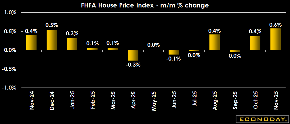 The seasonally adjusted FHFA house price index is up 0.6 percent in November from October and up 0.4 percent in October from September. The annual increase in the index is 1.9 percent from November 2024 and 1.7 percent from October 2024. Although home resales were at a softer pace before mortgage rates started to decline sharply in December, home valuations remained solid for home sellers and those refinancing current loans.
