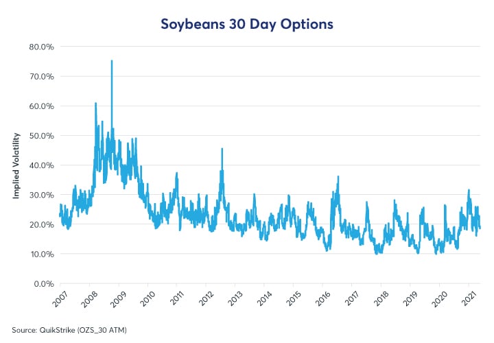 Thirty-day at-the-money (ATM) corn options have been showing some of the highest implied volatility since 2008 to 2012, while 30-day wheat options have also been showing elevated levels of volatility (Figure 3). Meanwhile, implied volatility on soybean options has been in a more ordinary range typical of the post-2012 period (Figure 4).