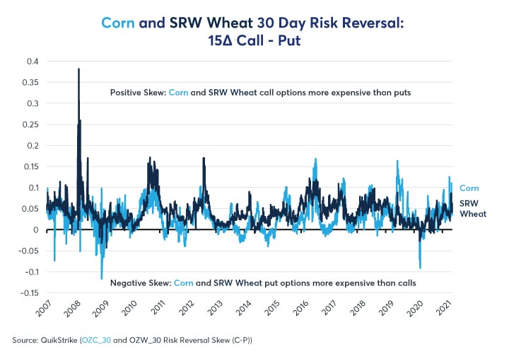Figure 6: Corn and wheat OTM calls are more expensive than equivalent OTM puts