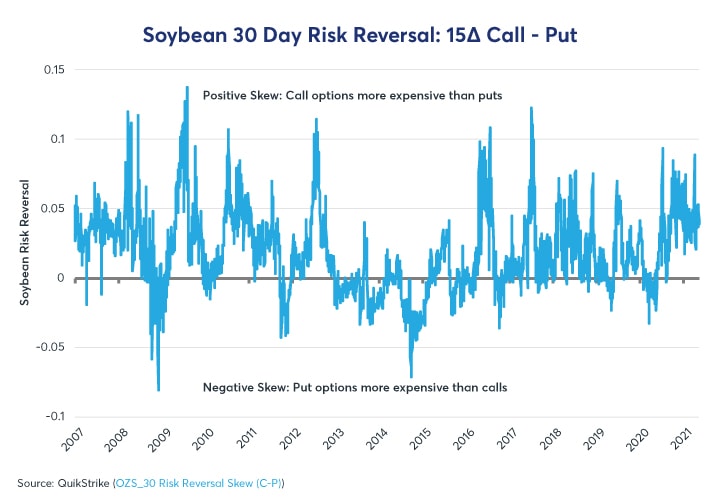 But there is more to options than 30-day ATM volatility: there is also the term-structure of volatility (how traders price volatility for different options expiry dates) and the skewness of options (how traders price extreme upside versus extreme downside risks). For corn and wheat, traders see the current period of exceptionally high volatility moderating as we move into late 2021 and early 2022. Rather than remaining in the 35-40% implied volatility range that one finds for 30, 60 and 90-day options, traders price volatility for the six-month period from now (180-day volatility in 180 days) between 20% and 25%. They also price a drop off in soybean volatility as well (Figure 5). In short, traders see a high risk of exceptional volatility in agricultural product prices over the summer, followed by a return to levels of implied volatility that are more typical of the 2013-2019 period.