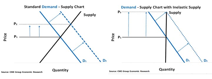 Figure 1: Elastic Supply (Left) is Less Price Volatile Than Inelastic Supply Markets (Right).