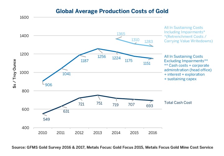 For metals like copper, gold and silver, there are two numbers to watch: the cash cost and all-in sustaining costs. Cash costs give one a sense of price levels at which producers will maintain current production. All-in sustaining costs give one a sense of what current and anticipated future price levels will be necessary to incentivize additional investment in future production. For example, for gold, cash-cost for mine operators averages around $700 per ounce while the all-in sustaining costs are around $1,250 per ounce (Figure 3).