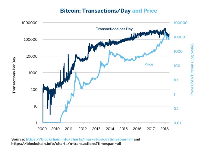 If stagnating numbers of trades and rising transaction do in fact play a role in provoking bitcoin price corrections, then one might hypothesize that a given correction might last until transaction costs fall and the number of transactions begins to rise again. Given the spike in transaction costs in early 2018 and the sharp (more than 50%) decline in the number of transactions being recorded in bitcoin during the same period, if these variables are in fact drivers of bitcoin prices, the price of bitcoin may have not yet found its balancing point. Although bitcoin prices are down about 50% from their recent highs, do not forget that in bitcoin’s two previous routs it fell by 84-93%. What happens to bitcoin prices going forward is, of course, unknowable at present. That said, we would keep any eye on these factors as proxies for the health of bitcoin demand.