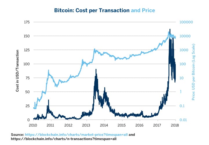 One often asked question is: will bitcoin replace fiat currencies such as the U.S. dollar? We think that the answer is a resounding no. Bitcoin’s price is too volatile to compete as a store of value; Bitcoin’s transaction costs are too high and too variable for it to be used as a medium of exchange.