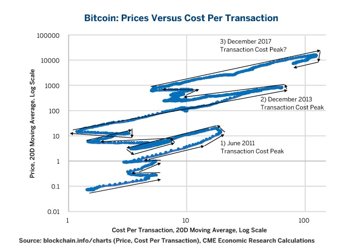 We are not suggesting that bitcoin prices are a function of trading costs or vice versa; however, there is an association between the two with mutual feedback loops. When bitcoin prices rise, eventually transaction costs appear to rise as well. When transaction costs reach levels that market participants can no longer bear, the price of bitcoin often corrects. A decline in prices puts downward pressure on transaction costs which, at least in the past, allowed for another bitcoin bull market once they had corrected to lower levels.