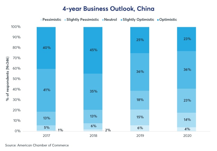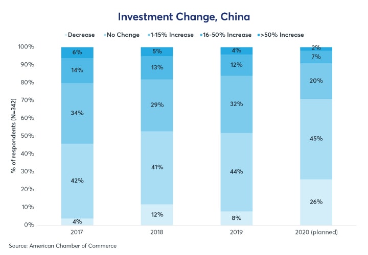 Among the 346 American businesses surveyed by the American Chamber of Commerce, overall optimism in the Chinese economy has declined 22 percentage points from 2017 to 2020 (Figure 1), while the proportion of business owners looking to decrease their investment in China has risen by 22 percentage points over the same period (Figure 2). The changes are reflected in the decisions undertaken by major producers. Several large electronics companies are moving production from China to Vietnam; a manufacturer of motorcycles to Thailand, and a producer of rubber to Malaysia.