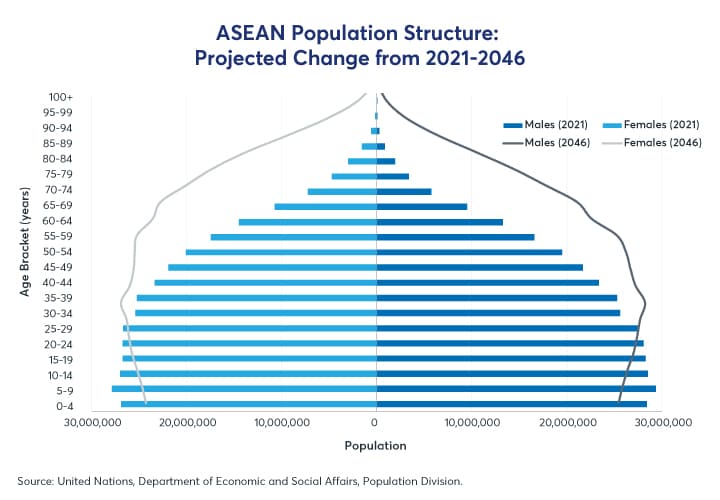 Figure 4: ASEAN is projected to see a slight decrease in youthfulness, and foster a middle-class to rival that of China