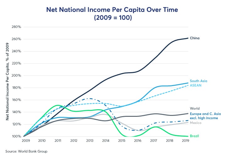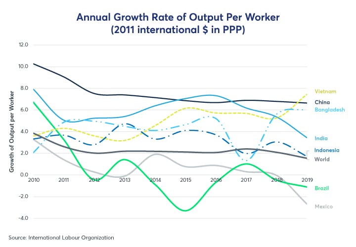 Productivity growth has slowed in the past decade, largely following a global trend. However, part of this slowdown can be attributed to falling levels of domestic rural-to-urban migration. For most emerging markets, the highest rate of productivity growth occurs during a period of significant migration from low-productivity rural areas (where the marginal product of labor is very low) to high-productivity urban towns and cities. Such was the case for Japan in the 1950s, the Soviet Union in the 1960s, and China in the 2000s. During much of this period, China enjoyed labor productivity growth as high as 14% -- facilitated by urban employment growth of over 4%. By contrast, the growth rate of urban employment in 2019 fell to its lowest level since 1993 at below 2%.