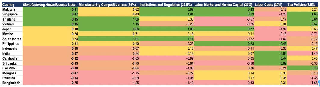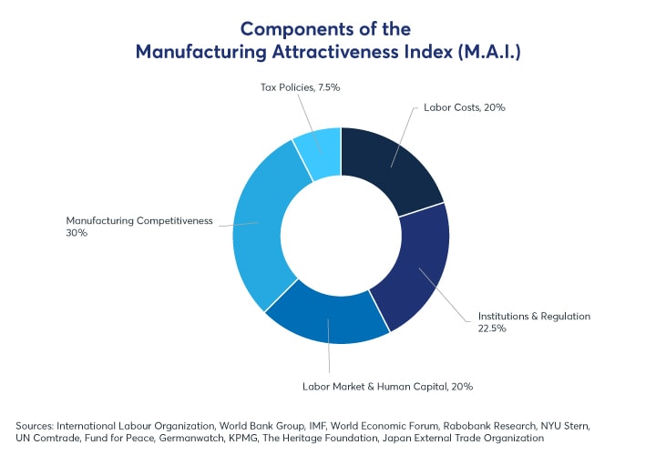 Dynamic economies looking to outcompete China on its home turf will need to offer more than competitive wages and an abundance of youth. Consequently, we have considered 23 economic indicators across 5 categories: manufacturing competitiveness, institutions and regulation, labor market and human capital, labor costs, and tax policies. The z-scores for each category have been used to calculate a weighted average in the following proportions (Figure 11). The result is the Manufacturing Attractiveness Index (MAI).