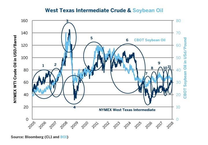 Once again, soybean oil prices hit bottom first, reaching a low of 25 U.S. cents in August 2015 – a 60% fall from their April 2011 peak. WTI prices hit bottom in February 2016 – a full six months later – at $26, down over 75% from their local high in 2011.