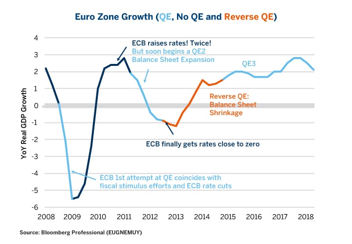 When it comes to quantitative easing (QE), go deep or go home. Using nearly a decade of evidence we look at what impact QE had in the United States, UK, Eurozone and Japan. Despite all the hopes and fears generated by the asset-purchase programs of central banks to stimulate their economies, for the most part, as far as we can tell QE had no actual impact on growth. Therefore, there is no reason to fear the ending of QE or even the reversing of QE as in the shrinking of a central bank’s balance sheet bloated by these asset purchases.