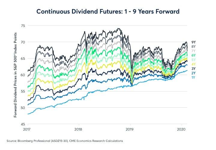 Moreover, most of the expected growth is front-weighted. S&P 500® ADI futures project dividends to grow to 61.5 index points in 2020 – a solid growth rate of 5.64% over 2019, and by 2.6% in 2021. After 2021, further growth is expected to flatline at around 1% per year.