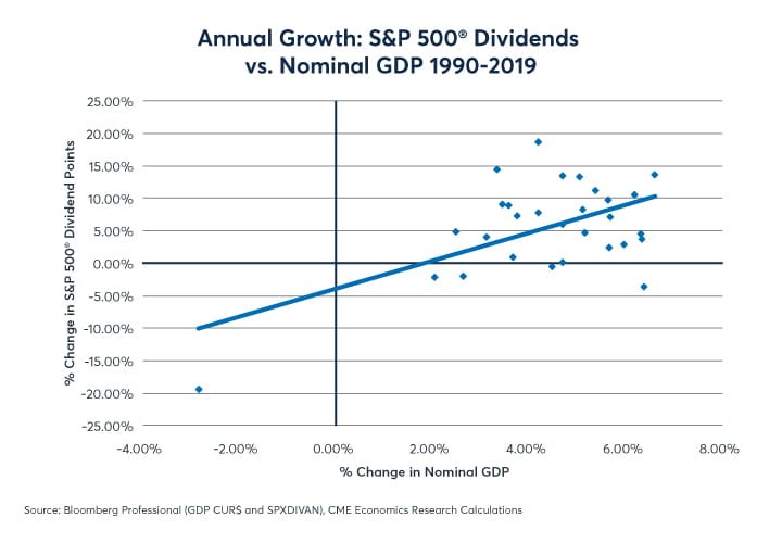 Figure 4: S&P 500® dividends have a much stronger correlation with GDP Growth of 0.55