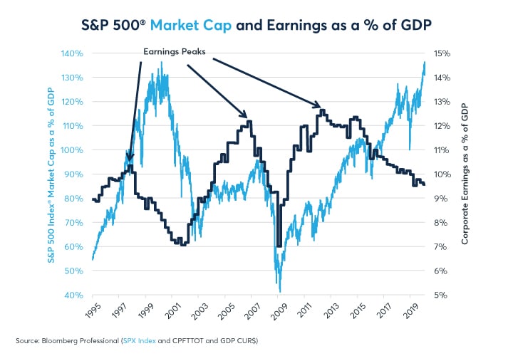 During the 2010s, pre-tax corporate earnings ranged from 10-12.5% of GDP. This was much higher than in previous decades. During the 1990s, corporate earnings accounted for between 7% and 10% of GDP and during the 2000s they ranged from 7% to 12% of GDP. Dividend payments did get a big boost from the corporate tax cut from 35% to 21% that took effect at the beginning of 2018. This tax cut, however, was a one-time deal and corporate taxes are unlikely to go lower and could possibly go higher in the 2020s, depending on Presidential election outcomes.
