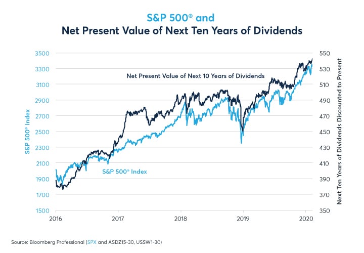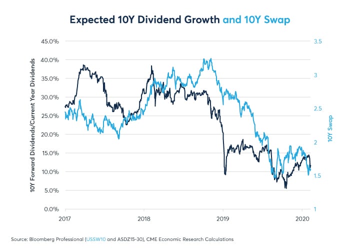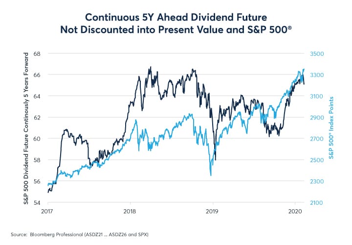 Lastly, dividend futures highlight one other potentially troubling aspect of equity markets: their dependence on low long-term rates. If one compares the level of the S&P 500® index to expected dividends calculated five years continuously forward using S&P 500® ADI futures, one sees that expected dividends largely led the market higher in 2017. However, beginning in 2018, expected dividends five years forward began to stagnate: as of January 31, 2020, five years forward expected dividends are only 1% higher than they were two years prior on January 31, 2018. In the meantime, the equity market has soared by 17% (Figure 9).