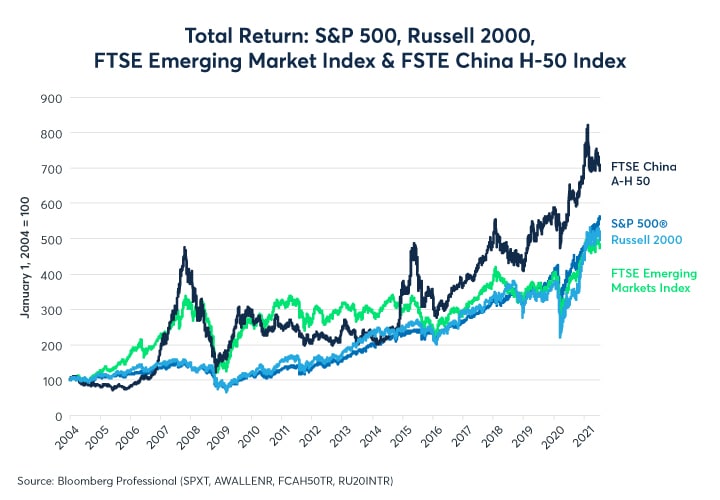 Equities have been a good place for investment over the past 17 years despite shocks like the global financial crisis and the pandemic. Since the beginning of 2004, the first full year for which we have data for the FTSE Emerging Market and China A-H 50 indexes, investors broadly made around 400% in emerging markets and around 600% if they invested only in Chinese shares. The 400% gain in the FTSE Emerging Markets total return index is very much in line with the total return for investors in the broadest and most diversified U.S. indexes like the S&P 500® and the Russell 2000 (Figure 1).