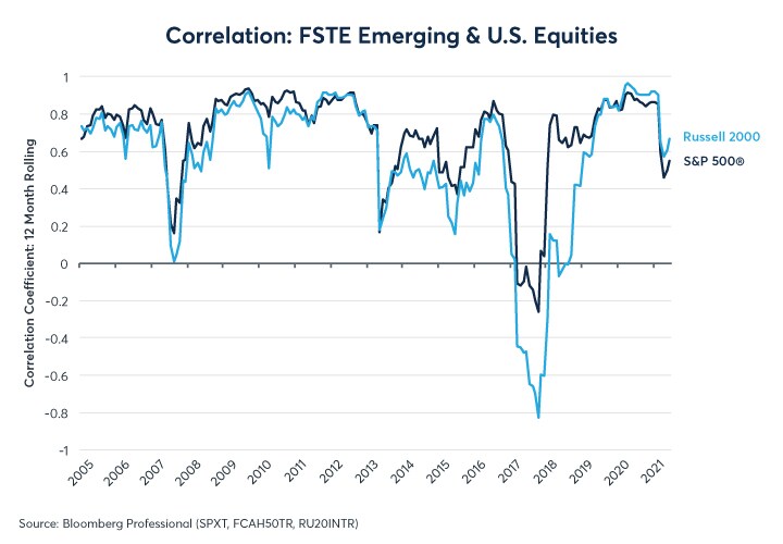 Figure 3: The FTSE Emerging Market Index has a positive but variable correlation to U.S. shares