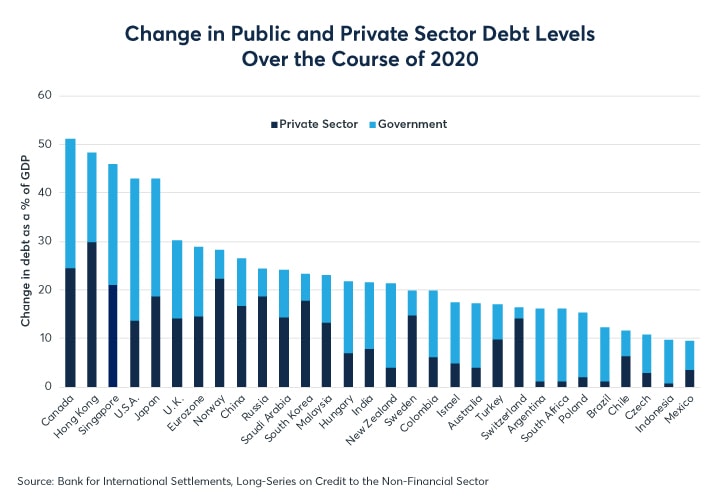 What is clear is economic policies has diverged enormously among nations over the course of the pandemic. China, Europe, Japan and especially the U.S. have seen their debt levels soar relative to the size of their respective GDPs (Figure 6). By contrast, most other emerging markets saw more modest increases in overall debt leverage. Part of the reason for this is that China and the developed markets began the pandemic with relatively low interest rates, which in turn placed the burden of supporting the economy on fiscal authorities.