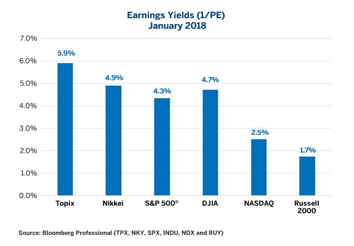 Figure 4: Japanese Stocks Sport Higher Earnings Yields (Lower P/E) Than U.S. Stocks.