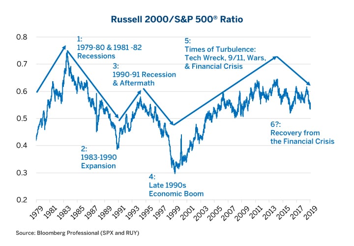 Figure 3: Outperforming Large-Cap Stocks Have Often Signaled That a Bull Market is Getting Old.