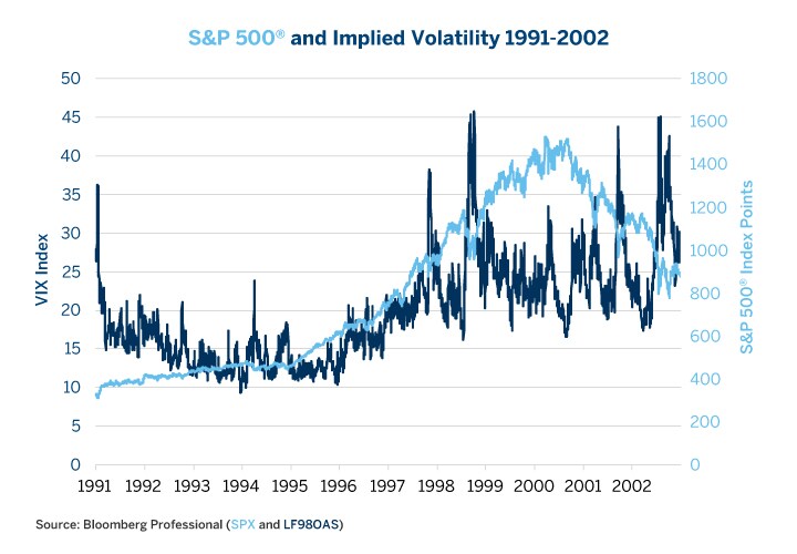 That said, there were many volatility spikes in the late 1990s (August and October 1997, August-October 1998). Each time the market sold off 10-20% it rallied back to new highs – at least until 2000 when it began a 50% decline to the bottom in 2002.