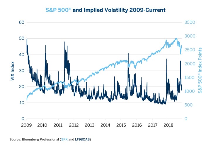 The question for investors this time is: Are we already in a pattern of rising equity option volatility? After volatility spiked in January 2018 it never came back down to its previous lows, perhaps anticipating the sharp correction in Q4 2018.