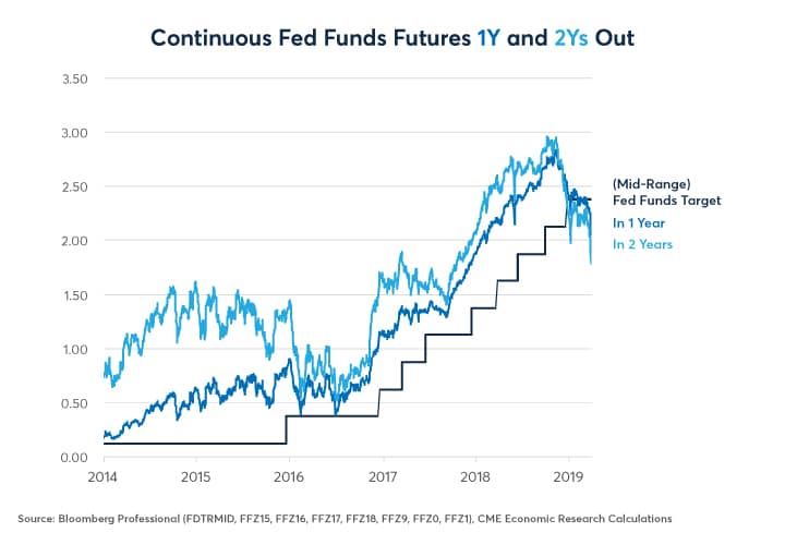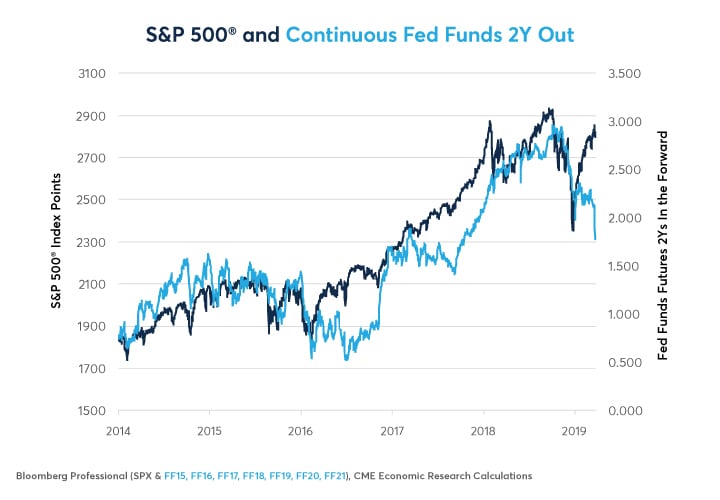 From early 2014 through 2018, expectations for rate hikes by the Federal Reserve (Fed) moved almost in lockstep with U.S. equity markets. Higher stock prices eventually translated into expectations that the Fed would hike rates while lower equities would cause (or at least coincide) with fixed-income investors backing off rate-hike expectations. Since the beginning of 2019, however, a yawning gap has developed between what equity investors and fixed-income investors expect (Figure 1).