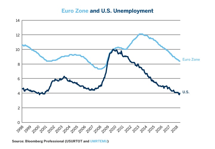 The contrast between the state of Europe’s economy and the state of its politics could hardly be starker. Despite some evidence of a slight moderation in the pace of growth, Europe’s economy continues to improve even as political situations Germany, Italy and Spain become increasingly delicate. Brexit remains the source of significant uncertainty; the refugee issue continues to roil politics and NATO’s foundations have developed cracks. As we head to the European Central Bank (ECB) meeting on July 26, markets appear to be more focused on what’s going wrong in Europe rather than what’s going well. From an economic perspective, there are three positive trends that are easily overlooked: