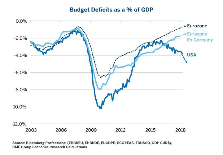 Figure 2: As the U.S. Fiscal Situation Deteriorates, Europe’s Budget Deficits Get Smaller and Smaller.