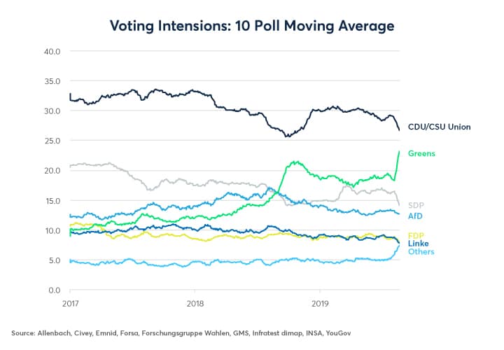 That day may come. Both German Chancellor Angela Merkel’s CDU/CSU Union and their junior coalition partner, the SDP, have been sinking in the polls (Figure 7). They turned in dreadful performances in both local and EU elections. The fastest way back to popularity would probably be to boost government investment in areas like green energy, roads and railroads. Furthermore, to the best of our knowledge, no politician has ever become unpopular because they slashed tax rates. With the next election scheduled for on or before October 24, 2021, Germany’s governing coalition has 28 months to figure out how to save themselves from electoral doom. With a 2% of GDP government budget surplus, negative borrowing costs for up to 15 years, ageing infrastructure and uncompetitive tax rates, isn’t the answer to their electoral woes obvious?