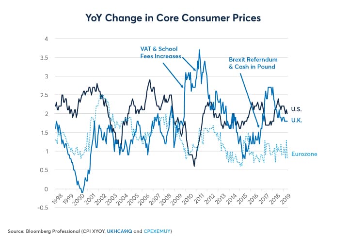 The eurozone’s economic expansion has hit a soft patch. Manufacturing has been shrinking for four months—but not at an alarming pace that would indicate a recession. The services sector continues to expand but at a much slower pace than in 2017 and 2018. Except for France, Europe remains politically fractured with fragile coalitions governing most countries. Recent EU elections hardly provided clarity, with nationalist and Eurosceptic parties and pro-Europe liberals advancing at the expense of traditional center-right and center-left parties.
