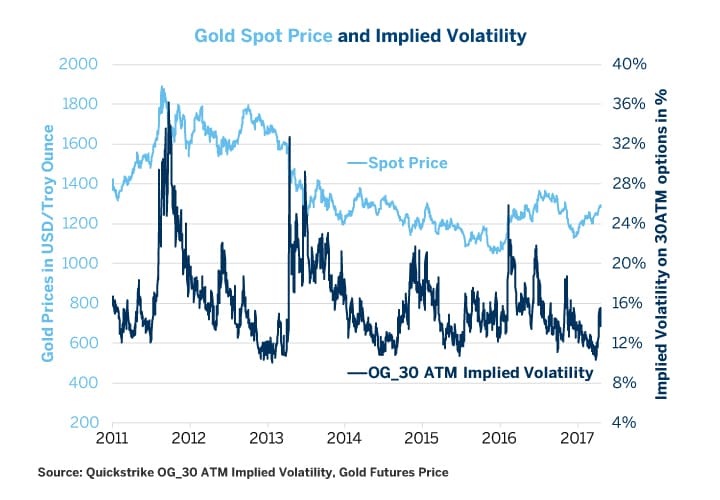 In the one-and-a-half months after the U.S. elections on November 8, gold prices plunged 12% on the assumption that the incoming president’s fiscal stimulus would boost the economy and lead to higher interest rates. However, with the Trump agenda running into numerous roadblocks since then, the yellow metal has rebounded, recouping nearly all its post-election losses. Gold options, meanwhile, have perked up from their recent lows, but with implied volatility at less than 14% they remain historically inexpensive (Figure 1). A podcast on this topic can be found here.