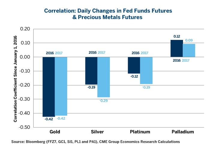 Figure 2: Gold is the Most (Negatively) Sensitive Precious Metal to Changes in Fed Funds Futures.