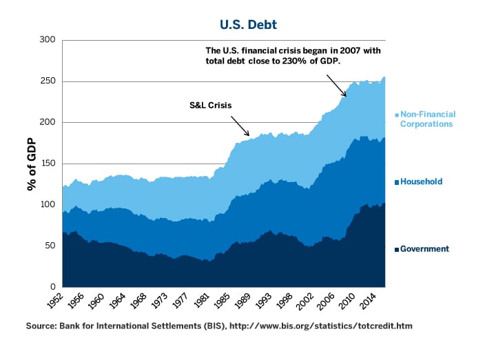 Beyond the intermediate-term issues of labor markets and inflation, there is one major long-term reason to think that the Fed can’t raise rates too aggressively without hurting the U.S. economy: U.S. debt levels remain astronomical. Since the 2008 crisis, there has been no deleveraging. Or more specifically, a modest post-crisis private sector deleveraging has been more than compensated for by a massive levering up in the public sector. Total U.S. debt remains above 250% of GDP (Figure 4). This explains better than any other factor why the Fed Funds target rate is still below 1% despite an unemployment rate of 4.5%. When unemployment was at similar levels in 2007, Fed Funds futures were at 5.25%. If the Fed put rates at that level now, it would risk recreating the 1930s Depression.