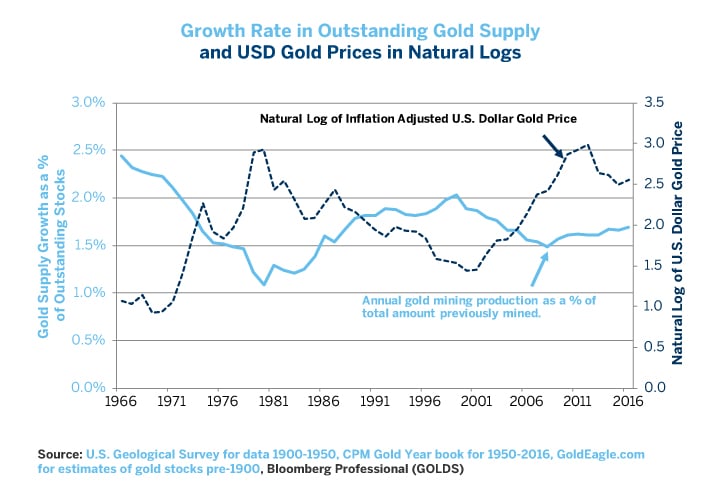 Demand factors tend to grab headlines for gold but don’t overlook the influence of supply. When gold mining output increases, gold prices tend to fall. This was the case between 1980 and 1998, and since 2010. When gold mining output falls, gold prices tend to soar. Falling mining output coincided with soaring gold prices in the late 1960s and throughout the 1970s as well as from 1999 to 2009 (Figure 5).