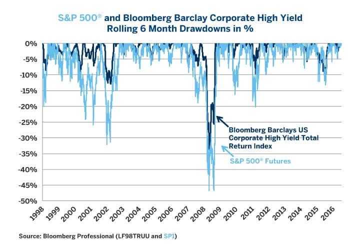 Although the S&P 500® and the Bloomberg Barclays U.S. Corporate High Yield Index are not perfectly correlated, their drawdowns tend to coincide (Figure 2). Since 2002, nearly every sharp sell-off in stocks has coincided with a sharp downward move in the price of high-yield corporate bonds (Figure 2).