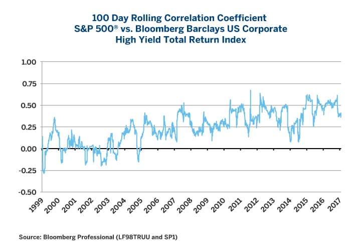 Figure 3: A Rising but Still Imperfect Correlation Between Stocks and High-Yield Bonds.