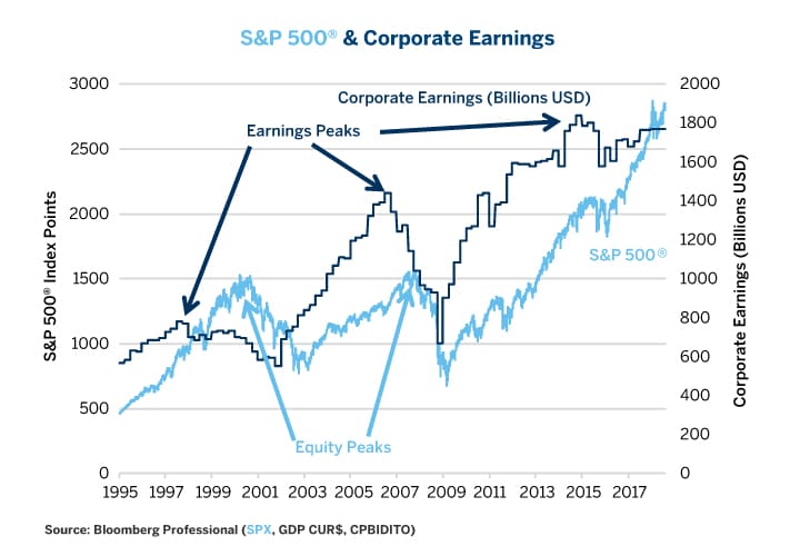 U.S. equities may be in the late stages of a bull market. In their early stages (1991-1996, 2003-2005 and 2009-2014), earnings and equity prices rise in tandem. In the late stages (1997-2000, 2006-2007 and 2015-), earnings stagnate or decline while prices continue to advance anyway (Figure 1). For the moment, earnings remain relatively robust but are not growing any faster than GDP. At some point, with rising interest rates, a tightening labor market and a trade war, earnings may begin to decline outright as they did during the late 1990s and in 2006 and 2007. A decline in earnings does not necessarily imply an immediate decline in stocks but with interest rates rising and the possibility of a recession around 2020, give or take a year, the risks to long-only equity positions are growing.