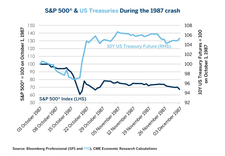 Moreover, during periods of market stress, Treasuries sometimes resist rallying as equity markets fall until the decline in equities becomes so extreme that it generates a flight-to-quality response. This was the case, for example, during the 1987 crash when equity markets fell out of bed between October 1 and October 19. The subsequent fixed income rally didn’t begin until October 20 (Figure 6).