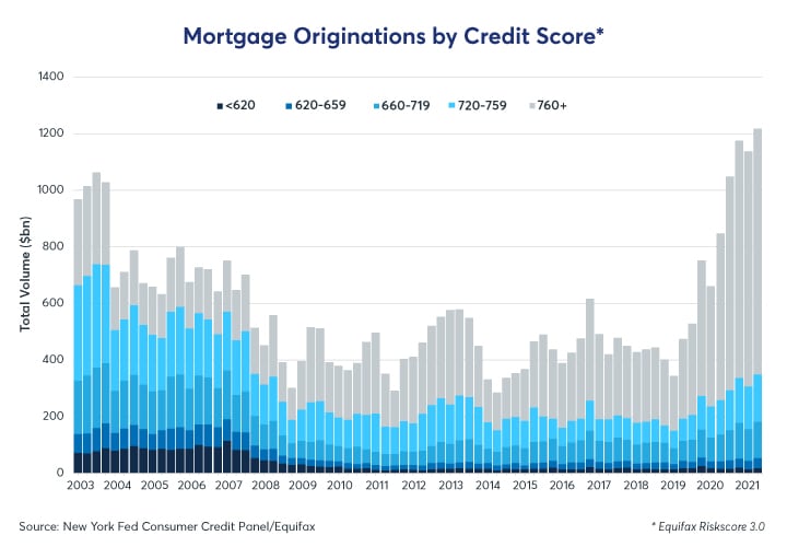 1. Low mortgage rates as a result of the Federal Reserve’s $40 billion monthly purchases of agency mortgage-backed securities and $80 billion in U.S. Treasuries. Mortgage originations (Figure 4), in the three months to the end of June exceeded $1.2 trillion – amounting to $4.6 trillion over four quarters, and pushing the total mortgage balance to more than $10 trillion. Notably, the boom in mortgage lending has been driven by loans to those with the highest credit scores. As such, it appears that the Fed’s quantitative easing (QE) programs could be fuelling buying of second and third homes by those who are already quite well off.