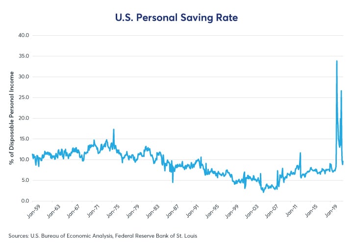 1. Nearly $4 trillion of savings accumulated during the lockdown (Figure 5), principally as a result of stimulus checks, rising stock markets, and fewer spending choices.