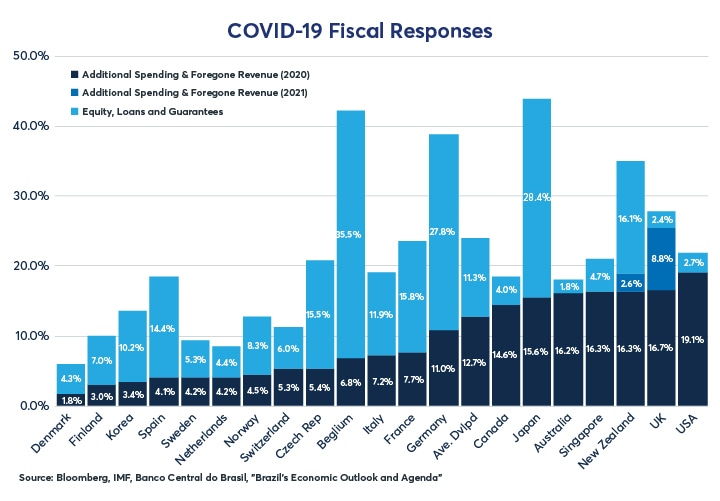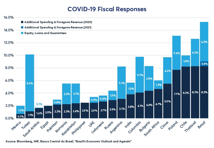 The need to mitigate the economic impact of the COVID-19 pandemic prompted nations around the world to take extraordinary fiscal measures. These measures fall broadly into two categories: 1) additional spending and foregone revenues, and 2) equity, loans and guarantees. Across the world’s middle-income countries, these fiscal measures have ranged in size from as little as 2% of GDP in nations like Mexico to as high as 15% in Brazil (Figure 1).