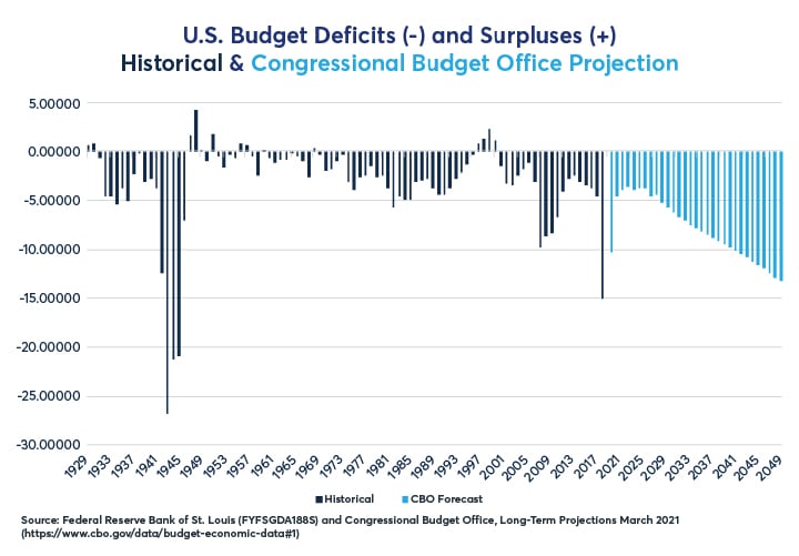 The sharp rise in debt levels is a global phenomenon and its long-term consequences have raised the interest of budget planners in numerous nations, including the United States. In March, the non-partisan Congressional Budget Office (CBO) released an assessment of the U.S. government’s long-term financial situation. The CBO projects that the U.S. budget deficit will shrink from 15% of GDP last year to 10% this year, and eventually settle at around 4% of GDP between 2024 and 2029. Longer term, the CBO projects deficits to grow from 2029 onward, with budget gaps widening to as much as 13.5% of GDP by 2050 (Figure 3).
