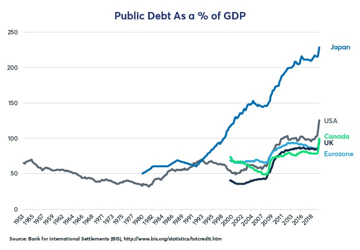 The CBO’s deficit scenario would take the U.S. marketable public debt (excluding the part owned by the U.S. Social Security system, for example) from 102% of GDP, where it is today, to 202% of GDP by mid-century. As we have seen, the U.S. fiscal trajectory is hardly unique. In fact, even before the pandemic, Japan already had levels of debt that exceeded 200% of GDP. Moreover, many European nations as well as Canada are on a fiscal path that looks remarkably like that of the United States (Figure 4).