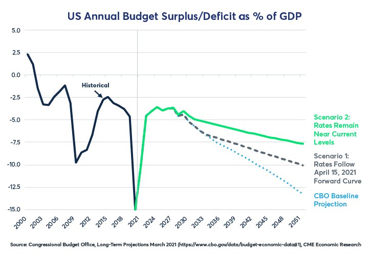 Figure 9: What if interest rates follow something more like the April 15, 2021, U.S. forward curve?