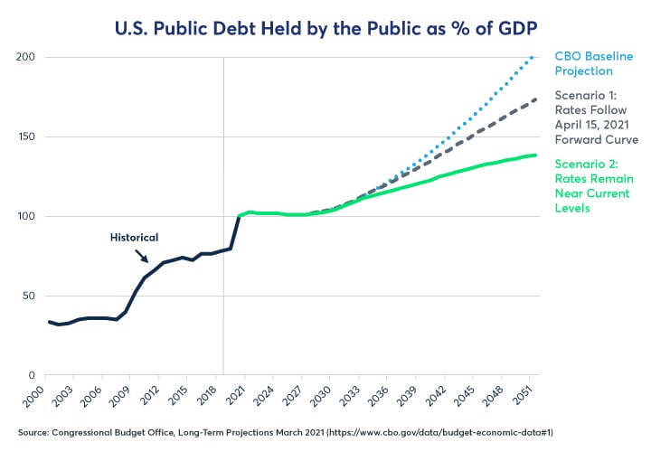 But should investors be concerned? The answer largely depends on the direction of interest rates. In the CBO’s scenario, discretionary spending, which is currently inflated due to COVID-19 relief measures, will shrink from 14% of GDP to below 8%. The shrinkage in discretionary spending will largely be offset, in the CBO’s view, by a rise in entitlement spending from 11% to 15.7% of GDP as the population ages and programs like Social Security, Medicare and Medicaid grow faster than the overall economy.